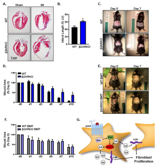 To determine the impact of β2AR-mediated fibroblast proliferation in vivo, WT and β2ARKO mice were subjected to sham or myocardial infarction surgery. β2ARKO mice had a larger infarct length 4 weeks following surgery, indicating impairments in fibrosis and wound healing (Figure 7A,B). Of note, β2ARKO mice had decreased survival following myocardial infarction (Supplemental Figure S7A). β2ARKO may play a role in cardiomyocyte survival and is known to play a critical role in regulating immune responses in the setting of myocardial infarction, which may be confounding factors [21,39]. To circumvent this, a dermal wound healing model was used. Wound healing in the skin occurs through many of the same mechanisms as in myocardial infarction without the influence of cardiomyocyte death and hemodynamics [40]. Increased proliferation occurred in mouse dermal fibroblasts and mouse embryonic fibroblasts treated with isoproterenol (Supplemental Figure S7B–E). These responses were abolished by IL-6 neutralizing antibody pre-treatment, suggesting that the β2AR responses observed in cardiac fibroblasts may be a universal fibroblast mechanism and applicable to other types of fibroblasts and a dermal wound healing assay may be a suitable model for what occurs in the heart. Skin biopsy punches were administered in WT and β2ARKO mice and wound closure was monitored over time. β2ARKO mice had a deceased rate of wound closure compared to WT mice, suggesting a decrease in cellular proliferation (Figure 7C,D). Importantly, this was not due to β2AR expression on immune cells, since WT mice that were irradiated to deplete hematopoietic progenitor cells and transplanted with β2ARKO bone marrow (BM) healed similarly to their WT bone marrow transplant (BMT) counterparts (Figure 7E,F).