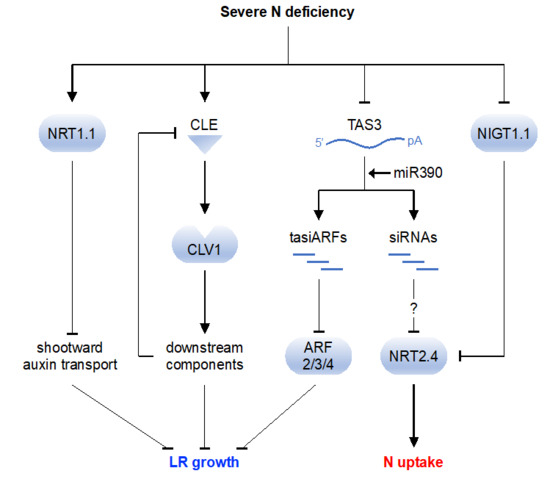 Modification of root architecture is also important for plant adaptation to changing N availability [15,16,17,18] and has been well studied in A. thaliana. Lateral root (LR) growth is stimulated under moderate N deficiency (275 or 550 µM in media [19]), enabling plants to explore available N. Stimulation of LR growth under moderate N deficiency is thought to be caused by induction of TRYPTOPHAN AMINOTRANSFERASE-RELATED 2 (TAR2), an auxin biosynthetic gene involved in development of LR primordia [20]. By contrast, under severe N deficiency, LR growth is repressed [19,21,22], which likely restricts investment in extending roots into N-poor environments [22]. Inhibition of LR growth under severe N deficiency is mediated by CLAVATA3/ESR-related (CLE) signaling peptides and their receptor protein, CLAVATA1 (CLV1) [22,23]. CLE genes (CLE1, CLE3, CLE4, and CLE7) are induced in response to N deficiency in root cells, and accumulated CLE peptides interact with CLV1, resulting in repression of genes involved in LR development [22,23]. Repression of LR growth under severe N deficiency is also caused by NRT1.1: NRT1.1 transports not only nitrate but also auxin and facilitates shootward auxin movement in LRs, resulting in reduced auxin concentration in LR tips and repressed LR growth [21].