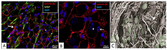 The human spiral ganglion. (A,B) Confocal-microscopic images showing immunoreactivity of laminin-β2, myelin basic protein (MBP), and 4′,6-diamidino-2-phenylindole (DAPI) stained cell nuclei. (A) Most type-1 spiral ganglion neurons (SGNs) are MBP-negative. Some non-myelinated perisomal segments show a rich expression of laminin (arrow). (B) Laminin-β2 immunoreactivity of basement membrane lining the extracellular surface of the satellite glial cells (SGCs) of the SGN bodies and nerve fibers. Type-1 SGN cell nuclei are round and darkly stained (*), while SGC nuclei are often crescent-like (arrow) and more lucent. Their cytoplasm shows no laminin expression. (C) Scanning-electron-microscopic image of the human spiral ganglion. Neural cell bodies are artificially colored green. The cell coat of several neurons shows longitudinal impressions (*) caused by crossing myelinated nerve fibers. Images are from the basal cochlear turn from subjects with normal pure-tone thresholds for their age (40–65 years). Adapted from [16], Figures 2A,B and 6A with permission.