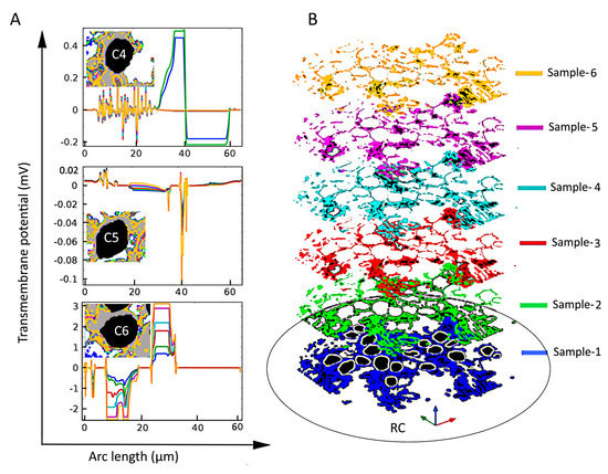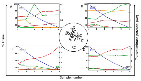 Figure 2 shows the dependence of the maximum value of Vm for each of 19 neighboring cells (C1–C19) in a two-dimensional section of RC (inset of Figure 2) as a function of the amount of surrounding neural tissue. Tissue reduction was achieved by systematically introducing a parameter into the conditional equation describing the electrical tissue conductivity as a function of pixel intensity (Section 4, Equation (1)). Maximal Vm values are shown for six values (“samples”) of the relative amount of tissue.