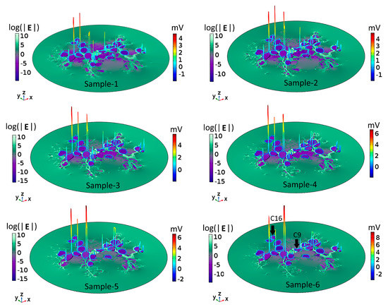 Electric field, E, and maximal transmembrane potential, Vm, for the six tissue samples shown in Figure 2. The color-coded peaks (blue-to-red) show the sites of maximal induced Vm on the spiral ganglion neurons. The distribution of E in Rosenthal’s canal is shown with a logarithmic scale (log(|E|) for better visualization; the reference field amplitude is 9 × 104 V/m. The Cartesian coordinate axes denote the image plane (x,y) and the dependent variable (z); namely, log(|E|) or the maximum of Vm. The formation of electric field “bright spots” (blue-to-white peaks) in the vicinity of neural tissues is due to the heterogeneous conductivity distribution of respective neural tissues. The black arrows in Sample-6 point to C9 and C16: their Vm remained the same across samples because the density of GroupB tissues was not changed in any of the samples.