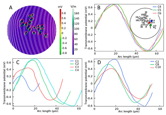 Electrical stimulation of spiral ganglion neurons (SGNs) in a homogeneous extracellular medium. (A) Color-coded representation of electric-field distribution in Rosenthal’s canal. The formation of hyperpolarization and depolarization sites on SGNs can be seen with the red-to-green color code, respectively. Streamlines of the electric field are shown in white. Evoked transmembrane potential, Vm, on specified SGNs having (B) similar sizes and distances from the electrode, where C4, C5, and C6 are shown in blue, green, and red color code, respectively in the inset, (C) different sizes but similar distances from the electrode, and (D) similar sizes but different distances from the electrode. Arc length denotes the perimeter of SGNs.
