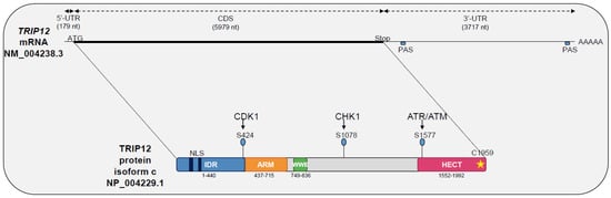 TRIP12 is a large protein with an apparent molecular weight estimated between 189 and 227 kDa for the long forms (Table 1). It comprises several characterized protein domains: a catalytic HECT domain, two protein/protein interaction domains (WWE (Tryptophan-Tryptophan-Glutamate) and ARM (Armadillo repeats)), and a recently identified intrinsically disordered region (IDR) (Figure 1). These domains confer structure and functional roles to the protein. TRIP12 protein domains are conserved during evolution and are subject to post-translational modifications that likely modulate its structure and activity. Several studies reported HECT, ARM repeats, and WWE crystal structure of other proteins [16,17,18]. However, TRIP12 has yet to be recovered in crystal form to establish its complete 3D structure.