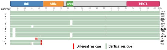 TRIP12 protein translation can occur from 26 different mRNA splicing variants (Table 1). This leads to the generation of 14 different TRIP12 protein isoforms (isoforms a to m) with a length comprised between 1722 aa and 2068 aa for the long isoforms a to l (Figure 2). The two short isoforms (m and n) contain only 440 and 411 aa, respectively. Multiple alignment analysis COBALT (Constraint-based Multiple Alignment Tool) (see Section Software and databases) reveals a high similarity between the long isoforms (Figure 2). The two most studied isoforms b and c (2025 and 1992 aa, respectively) only differ by a six aa deletion in the IDR domain and a 27 aa deletion in the WWE domain in the isoform c that potentially modifies the protein–protein interaction capacity of this isoform (see Section 3.2.). For further description of the TRIP12 protein, the 1992 aa isoform c (NP_004229.1) will be used as a reference. Even though several protein isoforms of TRIP12 potentially exist in human cells, it is still unknown whether the different isoforms are cell-specific or if they co-exist and in what proportion in the same type of cells. Unfortunately, commercially available antibodies are directed against epitopes that are common to the long isoforms of TRIP12 (except the isoform d). Therefore, they cannot discriminate the different long isoforms. However, immunostaining analysis using these antibodies reveals a nuclear localization of TRIP12 in several cell lines [7,14] and in human tissues (Human Protein Atlas). It can be explained by the presence of two putative bipartite variants of the classical basically Nuclear Localization Signals (NLS) (aa 73–94 and 136–152) (ELM software (see Section Software and databases)) (Figure 1). The importance of the N-terminal region in the maintenance of TRIP12 nuclear localization was demonstrated in our recent study [7]. Within the nucleus, two studies noted an absence of TRIP12 in the nucleoli [7,15].