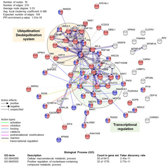 Schematic representation of human TRIP12-interacting protein–protein network (n = 76) and functional enrichment analysis using STRING software (see Section Software and databases). Network nodes represent proteins. Red nodes represent proteins belonging to cellular macromolecule metabolic process (GO term: 0044260), and purple nodes represent proteins belonging to the positive regulation of the nucleobase-containing compound metabolic process (GO-term: 0045935). Edges represent protein–protein molecular actions (indicated in the figure). Line shape indicates the predicted mode of action (indicated in the figure). Active interaction sources: text mining, experiments, databases, co-expression, neighborhood and co-occurrence. Minimum required interaction score: medium confidence (0.400). Green and orange filled circles indicate proteins implicated in “transcriptional regulation” and “ubiquitination/deubiquitination system”, respectively.