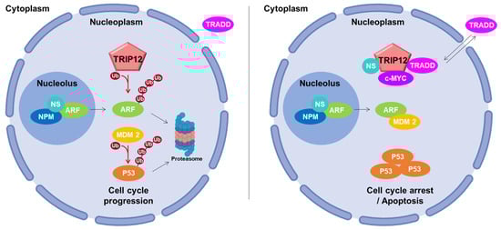 Schematic representation of TRIP12, ARF, and P53 pathway. On the left, TRIP12 controls ARF and indirectly P53 ubiquitination degradation by proteasome, while TRIP12 participates in cell cycle progression [58,75,96,115]. On the right, ARF is protected from TRIP12 when bound to nucleophosmin (NPM)/nucleostemin (NS) and localized in the nucleolus. Moreover, in the nucleoplasm, TRIP12 is sequestered by different proteins (in the presence of NS or TRADD and in high level c-MYC condition), blocking its interaction with ARF. ARF binds and inhibits MDM2, which leads to P53 accumulation and cell cycle arrest.