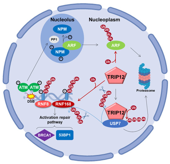 Oncogenic stimuli trigger the activation of checkpoints that delay or prevent tumorigenesis. The DNA damage repair (DDR) pathway and ARF protein are two major checkpoints that both act by the protein P53. Initially studied independently, the interconnection between these two checkpoints in tumorigenesis is gaining notoriety. For example, Velimezi et al. discovered that the key DDR kinase ATM negatively regulates the abundance of ARF with the implication of TRIP12 [118]. In response to DNA damage, the kinase ATM activates the protein phosphatase 1 (PP1), which in turn, dephosphorylates the nucleolar protein NPM (Figure 7). This dephosphorylation liberates ARF from NPM, rendering it susceptible to degradation via the action of TRIP12 in the nucleoplasm. Chen et al. further reported the contribution of TRIP12 in ARF degradation in response to DNA damage induced by doxorubicin [115]. The data showed that after DNA damage, the degradation of ARF is strongly attenuated in TRIP12 knockout mouse embryonic fibroblasts (MEFs). Another study identified the serine S1577 of TRIP12 (Figure 1) as phosphorylated by the kinases ATM/ATR, which suggests that post-translation modifications are possibly critical for a proper implication of TRIP12 in the DDR network [45].
