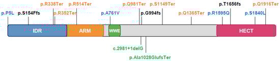 Schematic illustration of published TRIP12 gene mutations in intellectual disorders. Mutations in blue are missense, mutations in orange are nonsense, mutations in black are frameshift. Mutations in green are located in splice donor sites. From [10,142,143,144,145].