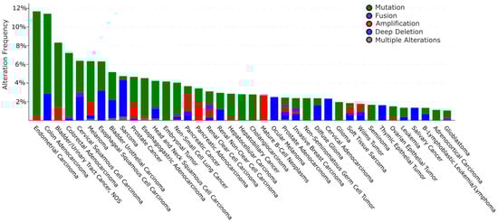 - Cerami, E.; Gao, J.; Dogrusoz, U.; Gross, B.E.; Sumer, S.O.; Aksoy, B.A.; Jacobsen, A.; Byrne, C.J.; Heuer, M.L.; Larsson, E.; et al. The cBio Cancer Genomics Portal: An Open Platform for Exploring Multidimensional Cancer Genomics Data: Figure 1. Cancer Discov. 2012, 2, 401–404. [Google Scholar] [CrossRef]