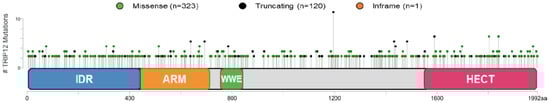 The cBioPortal database (see Section Software and databases) provides the frequency of CNA (Copy Number Alteration) appearance in TRIP12 gene in cancers [149,150]. It includes mutations, fusions, amplifications, deep deletions, and multiple alterations (Figure 9). On average, the TRIP12 gene is altered in 1.84% of cancer patients (over 27,235 patients). This rate remains relatively weak compared to other genes, for instance, TP53 (39.8%). TRIP12 gene alteration frequency varies from 11.7% in endometrial carcinoma to 1.06% in glioblastoma patients. Up to now, 463 mutations have been located in the human TRIP12 gene (Figure 10). These punctual alterations do not accumulate in hot spots but rather spread all along the protein sequence. Among them, 323 were classified as missense, 120 were classified as truncating mutation, and one arises from nucleotides insertion without an open reading frameshift. Additionally, 20 alterations result from a fusion between the TRIP12 gene and other genes such as PID1 (PTB-containing, cubilin and LRP1-interacting protein) or KIF1A (Kinesin-like protein). However, a nonsense mutation is retrieved 10 times at the residue S1195 generating a truncated protein: six times in colon cancer, two times in uterine cancer, and once in lung and breast cancer. The main issue regarding TRIP12 gene alterations and in particular point mutations is whether these mutations play a causal role in cancer initiation or progression (“driver” mutations) or if they only randomly appear during cancer establishment as a consequence of, for instance, DNA repair failure (“passenger” mutations).