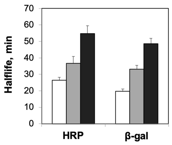 First, we performed experiments to explore the effects of protein confinement on the thermal stability of the model enzymes, horseradish peroxidase and β-galactosidase. For this, we compared the half-lives of the enzymes encapsulated in different concentrations of agarose with solution-phase enzymes at temperatures that lead to rapid loss in their function [31,32,33,34]. We used 0.5% and 2% agarose gels for these studies as previous studies have reported significant differences in the average pore radii for these concentrations (ca. 300 nm for 0.5% and ca. 75 nm for 2% agarose gels) [27,28]. The half-lives of agarose-encapsulated HRP were ca. 37 min for 0.5% agarose and ca. 55 min for 2% agarose, showing the clear dependence of agarose concentration on enzyme stability (Figure 1). Furthermore, these results indicated a statistically significant enhancement in thermal stability for agarose-encapsulated HRP relative to solution-phase HRP, whose half-life was measured to be ca. 26 min. These effects of agarose encapsulation on enzyme stability, i.e., greater enhancements in stability at higher concentrations of agarose, were not unique to HRP, but also observed for β-gal (Figure 1). The observed influence of agarose concentration on the stability of the encapsulated enzymes was expected, as our previous investigations reported higher tolerance of enzymes encapsulated in 2% agarose to chemical denaturants compared with those encapsulated in 0.5% agarose [15]. When we explored the effects of confinement on the optimum temperatures of the enzymes, we observed that the enhanced thermal stability of agarose-encapsulated enzymes was also reflected by the higher optimal temperatures for enzymes encapsulated in agarose (Figure 2).