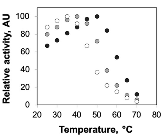Optimum temperatures of HRP encapsulated in agarose gels. The enzyme activities of solution-phase HRP (white circles) and HRP encapsulated in 0.5% agarose (gray circles) and 2% agarose (black circles) were measured at different temperatures ranging from 25 to 70 °C. Each data point represents an average of triplicate measurements, with standard deviation <15%.