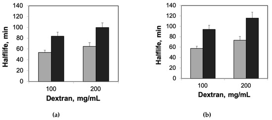 Next, we designed experiments to explore the combined roles of confinement and crowding on the thermal stability of enzymes. We used dextran for these experiments, as dextran has been shown to increase protein stability, both on its own and in combination with other crowding agents [9,23,29,30]. Our experiments confirmed a concentration-dependent increase in protein stability for HRP and β-gal in the presence of dextran (Figure S1). When we repeated the experiments using agarose–dextran hybrid gels (Figure 3), we observed higher increases in half-lives of enzymes encapsulated in agarose gels containing dextran (compared with those encapsulated in agarose gels without dextran, Figure 1). Moreover, we observed that the relative increases in the half-lives in the presence of dextran were higher for agarose-encapsulated enzymes relative to solution-phase enzymes in the presence of dextran (Table 1). The observed non-additive effects of confinement and crowding on the enzymes encapsulated in agarose–dextran hybrid gels were consistent with previous investigations that demonstrated greater stabilizing effects of mixtures of crowding agents when compared with individual crowding agents [22,23]. It is important to note that the differences in relative increases in the half-lives due to the presence of dextran did not scale proportionally with agarose gel concentration (Table 1). However, it is reasonable to expect a saturation in the combined benefits of confinement and crowding, given the already high degree of confinement and enzyme stabilization in 2% agarose gels.