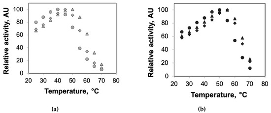 Optimum temperatures of HRP encapsulated in agarose–dextran hybrid gels. The enzyme activities of HRP encapsulated in agarose (circles) and agarose incorporating 100 mg/mL (diamonds) and 200 mg/mL (triangles) dextran—(a) 0.5% agarose (gray markers) and (b) 2% agarose (black markers)—were measured at different temperatures ranging from 25 °C to 70 °C. Each data point represents an average of triplicate measurements, with standard deviation <15%.