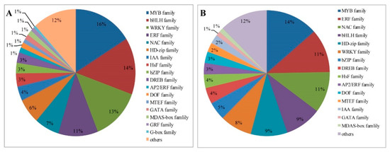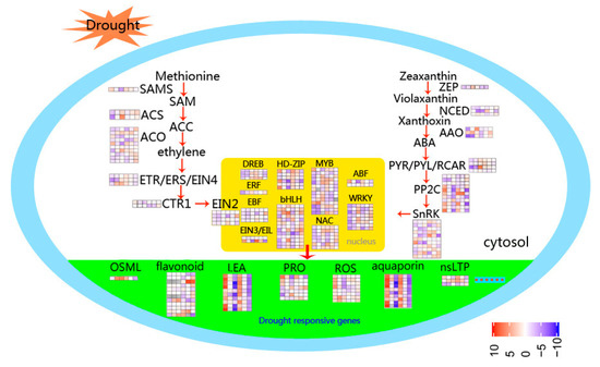 2.4. Drought-Responsive Genes Are Mainly Related to Photosynthesis, Signal Transduction and TFs
