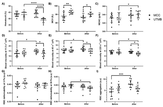 Evolution of hematological and hemorheological parameters before and after Ultra-Trail du Mont Blanc (UTMB) (n = 12) or Martigny–Combes à Chamonix (MCC) (n = 11) race. (A) Hematocrit (Hct); (B) Mean corpuscular volume (MCV); (C) Mean corpuscular hemoglobin concentration (MCHC); Blood viscosity measured at (D) 11.5 s−1 (E) 45 s−1, (F) 225 s−1; red blood cell (RBC) deformability measured at (G) 3 Pa, (H) 30 Pa and (I) RBC aggregation. Values are represented as means ± SD. Statistical difference: * p < 0.05, ** p < 0.01, *** p < 0.001, **** p < 0.0001.