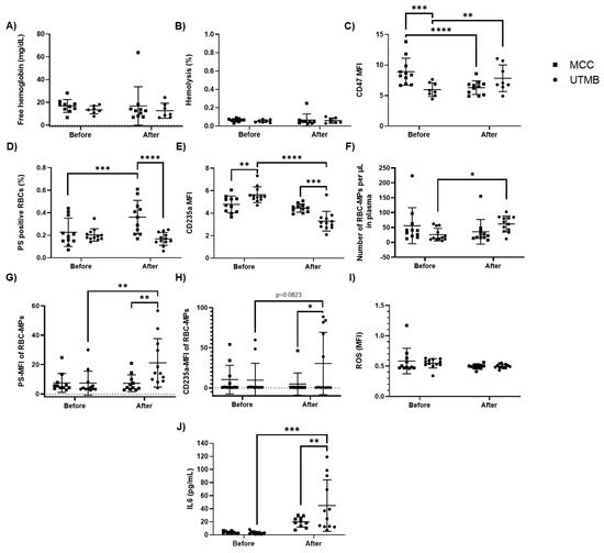 Evolution of markers of RBC damage and senescence and IL6 levels before and after UTMB or MCC race. (A) Plasma free hemoglobin (UTMB, n = 7; MCC, n = 10); (B) Percentage of hemolysis (UTMB, n = 7; MCC, n = 10); (C) Mean fluorescence intensity (MFI) of CD47 expressed at RBC surface (UTMB, n = 8; MCC, n = 11); (D) Percentage of RBC exposing phosphatidylserine (PS); (E) MFI of CD235a expressed at RBC surface; (F) Number of RBC-microparticles (MPs) per µL in plasma; (G) Mean fluorescence intensity of PS expressed in RBC-MPs; (H) MFI of CD235a expressed in RBC-MPs; (I) RBC Reactive oxygen species; (J) Plasma interleukin 6 (IL-6) content. When not specified 12 samples were analyzed for the UTMB and 11 samples for the MCC. Values are represented as mean ± SD. Statistical difference: * p < 0.05, ** p < 0.01, *** p < 0.001, **** p < 0.0001.