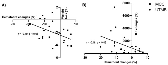 Correlations between the changes in hematocrit observed in both races and (A) weight loss; (B) IL-6 changes. All changes are expressed in percent of the resting values.