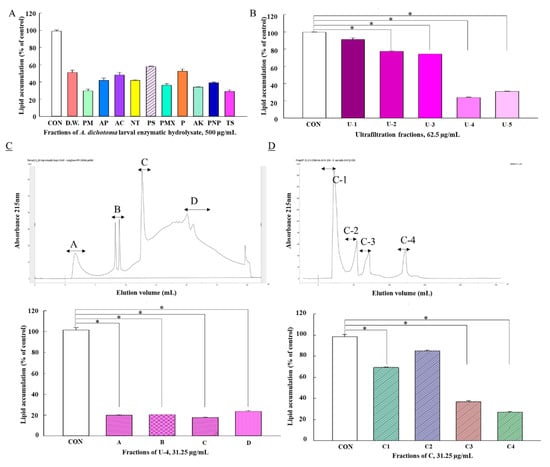 Inhibitory effect of Allomyrina dichotoma larvae enzyme hydrolysate on lipid accumulation. (A) Inhibition of adipocyte differentiation by enzymatic hydrolysates of A. dichotoma larvae. (B) Anti-obesity activity of fractions of A. dichotoma enzymatic hydrolysate classified by molecular weight. (C) Anti-obesity activity (upper panel) and ion-exchange chromatography (lower panel) of 10‒100 kDa ultrafiltration fraction. (D) Anti-obesity activity (upper panel) and reversed-phase column fractional chromatogram (lower panel) for preparative ion-exchange chromatography of peak C from (C). Lipid accumulation was measured by Oil Red O staining; untreated 3T3-L1 cells were used as control. PM: Promod 278P; AP: Alphalase NP; AC: Vision Biochem, Alcalase; NT: Neutrase; PMX: PS Pepsin Protamex; P: Pancreatin; AK: Food Pro Alkaline protease; PNP: Protease NP; TS: Trypsin. Data are expressed as mean ± standard error of the mean. * p < 0.05 vs. control (CON) cells. (n = 3 per group).