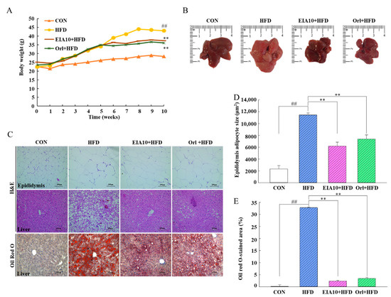 (A) Body weight and (B) liver histology of HFD group mice. Glu-Ile-Ala-Gln-Asp-Phe-Lys-Thr-Asp-Leu (EIA10) reduces lipid accumulation in the liver and adipose tissue. (C) Histological analysis of the liver and epididymal adipose tissue by hematoxylin and eosin (H&E) staining and Oil Red O staining. Scale bar: 100 um (D) Mean adipocyte area (μm2). (E) Mean Oil Red O staining in hepatocytes area (μm2). Data are expressed as mean ± standard error of the mean. ## p < 0.01 vs. control (CON) group. ** p < 0.01 vs. HFD group (n = 8 per group). HFD, high-fat diet; Orl, Orlistat.