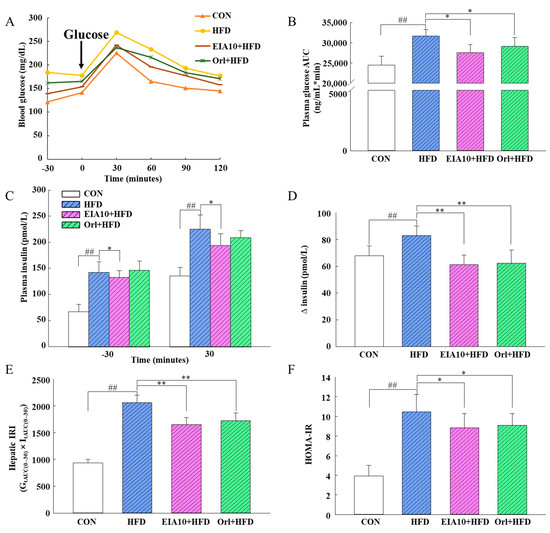 EIA10 treatment improved metabolic parameters of glucose tolerance and insulin resistance in HFD mice. (A) Comparison of oral glucose tolerance test results. (B) Area under the curve (AUC). (C) Plasma insulin concentration (pmol/L) 30 min before (−30) and 30 min after (30) oral glucose administration. (D) Glucose-induced insulin secretion after oral glucose administration. (E) Hepatic insulin resistance index (hepatic IRI). (F) Homeostasis model assessment of insulin resistance (HOMA-IR). Data are expressed as mean ± standard error of the mean. ## p < 0.01 vs. control (CON) group. * p < 0.05, ** p < 0.01 vs. HFD group (n = 8 per group). HFD, high-fat diet; Orl, Orlistat.