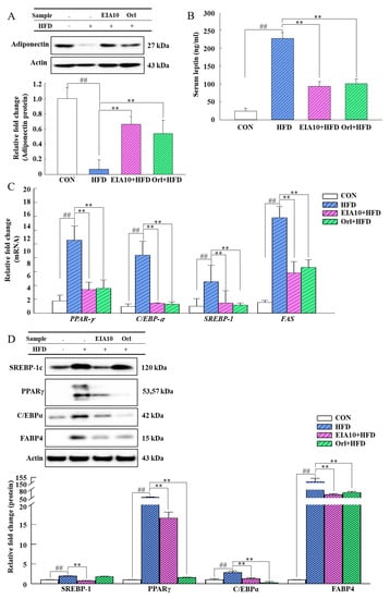 Effect of EIA10 on protein levels of (A) adiponectin in mouse epididymal adipose tissue and (B) serum leptin. (C) mRNA levels of transcription factors in mouse epididymal adipose tissue quantified by real-time PCR. (D) Western blotting. “+” and “–” meaning with or without HFD treatment. Data are expressed as mean ± standard error of the mean. ## p < 0.01 vs. control (CON) group. ** p < 0.01 vs. HFD group (n = 8 per group). HFD, high-fat diet; Orl, Orlistat.