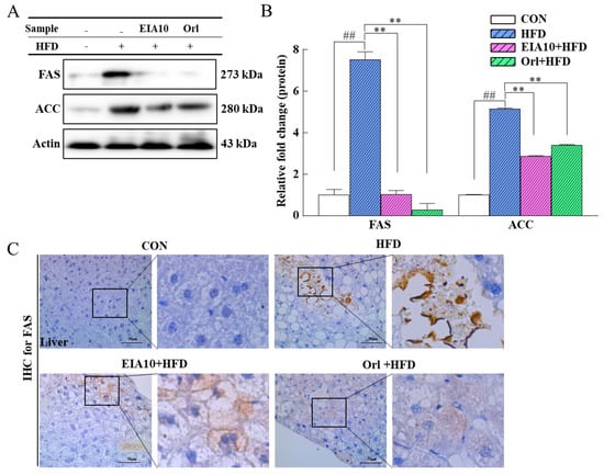 Effect of EIA10 on (A,B) protein of lipogenic enzyme in epididymal adipose tissue of animals treated with different groups as quantified by Western blot. (“+” and “–” meaning with or without HFD treatment). (C) IHC-stained FAS is shown in mouse liver tissues (left and right images in C, right images in C represent areas in the black rectangles). Scale bar: 50um Data are expressed as mean ± standard error of the mean. ## p < 0.01 vs. control (CON) group. ** p < 0.01 vs. HFD group (n = 8 per group). HFD, high-fat diet; Orl, Orlistat.