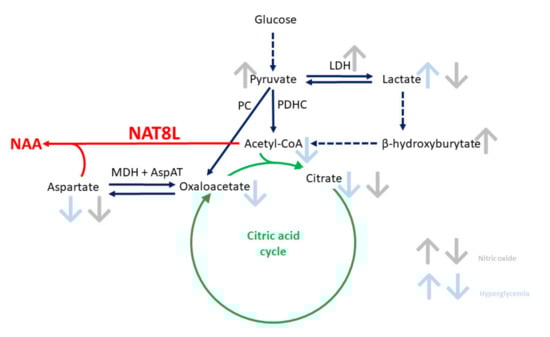 Type 1 diabetes mellitus (T1D) is an insulin-dependent chronic metabolic disease that most often develops during childhood and is caused by autoimmune reaction leading to impaired insulin production [16,17,18]. Lack of the endogenous insulin resulted in an abnormal elevation of blood glucose level [16,17,18]. Uncontrolled hyperglycemia might evoke a metabolic crisis, such as lactic acidosis, ketoacidosis, and finally oxidative stress [16]. Moreover, several clinical studies reported significantly lower brain NAA level measured in type 1 diabetic patients [16,17,18]. Since the NAA network interweaves energy pathways that are susceptible to oxidative stress, we assumed that the NAA network will be vulnerable to these conditions as well. Therefore, our overall goal was to identify biochemical variables that might decrease the NAA brain level in the progression of type 1 diabetes. To separate the impact of oxidative stress and hyperglycemia effects on NAA network, the investigated in vitro models were exposed to either a high concentration of nitric oxide from a generator (model of oxidative stress) or to acute hyperglycemia. Streptozotocin-injected Wistar rats were sacrificed as in vivo model of type 1 diabetes. As results, our studies revealed that oxidative stress is not an up- or downregulating factor for the NAA network. We also noted that brain cells can handle shortages of N-acetylaspartate substrates. Therefore, we hypothesize that to regulate the NAA network, NAT8L enzymatic activity or gene expression have to be regulated rather than substrate shortages.