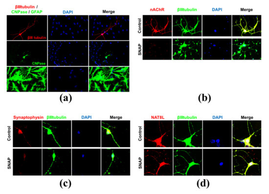 The immunostaining made for the purposes of this project: (a) cell types recognized in the neural stem cells model stained by the antibody against β-III-tubulin (neuronal marker), CNPase (2′,3′-Cyclic-nucleotide 3′-phosphodiesterase, oligodendrocytic marker) and glial fibrillary acidic protein (GFAP) (astrocytic marker). The impact of 0.2 mM SNAP (S-Nitroso-N-acetylpenicillamine) on primary neurons stained by the antibody against β-III-tubulin and: (b) nicotinic acetylcholine receptor (nAChR); (c) synaptophysin; (d) NAT8L. The images are representative for four independent sets of experiments.