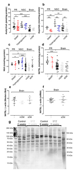 The impact of toxic factors on the NAA network measured in primary neurons (PR), neural stem cells (NSC) and brain tissue (Brain): (a) acetyl-CoA level; (b) aspartate level; (c) N-acetylaspartate level; (d) aspartate N-acetyltransferase (NAT8L) activity; (e) NAT8L protein level (Western blot); (f) Nat8l mRNA level (real-time RT-qPCR); (g) representative WB (Western Blot) membrane image for NAT8L protein. Data are means ± SD from 5–22 observations per group. Significantly different from the control: * (p–value < 0.05), ** (p–value < 0.01), *** (p–value < 0.001).