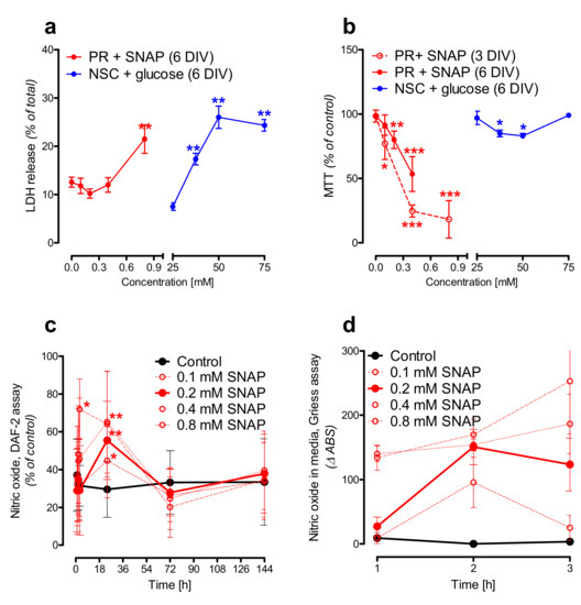 The impact of toxic factors on primary cells. (a,b) viability tests in both primary cell lines; (c,d) nitric oxide accumulation in primary neurons (PR). (a) LDH in media test; (b) methylthiazolyldiphenyl-tetrazolium bromide (MTT) test; (c) intracellular accumulation of nitric oxide (DAF-2 fluorescence assay); (d) in media accumulation of nitric oxide (Griess spectrophotometric assay). Data are means ± SD from 3 to 20 observations per group. Significantly different from the control: * (p–value < 0.05), ** (p–value < 0.01), *** (p–value < 0.001).