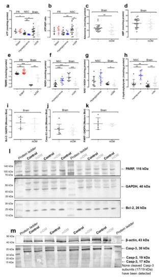 The impact of the toxic factors on intracellular homeostasis measured in primary neurons (PR), neural stem cells (NSC) and brain tissues (Brain). Nucleotides: (a) ATP level; (b) ATP/ADP ratio; (c) adenosine level; (d) AMP level; (f) NADH (reduced nicotinamide adenine dinucleotide) level; (g) total NAD (nicotinamide adenine dinucleotide) level. (e) TBARS level, cytosolic oxidative stress markers. (h) β-hydroxybutyrate level, ketoacidosis markers. Apoptosis markers (protein level measured by Western blot): (i) B cell lymphoma 2 (Bcl-2); (j) caspase-3 and cleaved caspase-3 (Casp-3); (k) poly-(ADP-ribose)-polymerase (PARP). Representative WB membrane images for: (l) PARP, Bcl-2, and GAPDH (glyceraldehyde 3-phosphate dehydrogenase) proteins; (m) Casp-3, cleaved Casp-3, and β-actin proteins. Data are means ± SD from 3 to 22 observations per group. Significantly different from the control: * (p–value < 0.05), ** (p–value < 0.01), *** (p–value < 0.001).