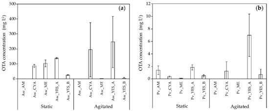 Ochratoxin A (OTA) production in Adye and Mateles (AM), Czapek Yeast Autolysate (CYA), Malt Extract (ME), Yeast Extract Sucrose_A (YES_A), and YES_B media by (a) Aspergillus westerdijkiae (Aw) and (b) Penicillium verrucosum (Pv) under static and agitated conditions. Data are means ± standard deviation using three biological replicates.