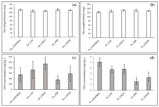 The effect of 0.5 mM FER, COUM, CAF, and CHLO on fungal growth and OTA biosynthesis by A. westerdijkiae and P. verrucosum was evaluated after 11 days of culture. The 0.5 mM concentration was chosen according to literature data regarding previously published anti-mycotoxin efficiencies of phenolic acids and their physiological levels in plant tissues [14]. Concentrations closed to 0.5 mM were reported for free CHLO in maize kernels at the earliest stages of grain development [24] or in coffee [25] and for free FER in wheat grains at maturity [26].