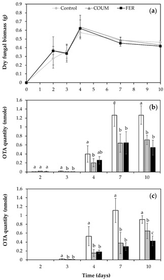 Kinetics of (a) fungal biomass and ochratoxin A (OTA) accumulated in (b) mycelia and in (c) supernatants of Penicillium verrucosum broths supplemented with 0.5 mM ferulic acid (FER) (black) and p-coumaric acid (COUM) (gray) or in non-supplemented control (white). Differences between control and tested phenolic acids in terms of OTA were determined separately for each day with multiple comparisons tests using the Dunn–Sidak method. Different letters indicate significant differences (p < 0.05). Values are expressed as means ± standard deviation using five biological replicates.