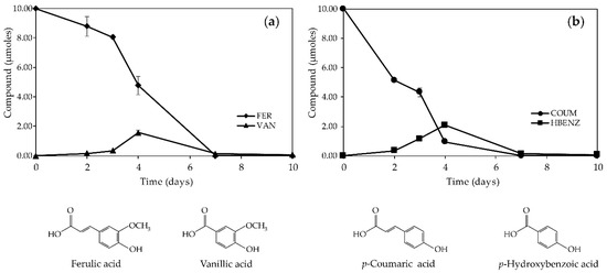 Kinetics and chemical structure of (a) ferulic acid (FER), (b) p-coumaric acid (COUM), and their metabolites in the supernatants of Penicillium verrucosum cultures supplemented with 0.5 mM of FER and COUM. Values are expressed as means ± standard deviation using five biological replicates. VAN—vanillic acid; HBENZ—p-hydroxybenzoic acid.