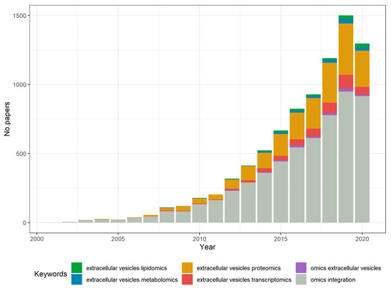 Evolution of interest in omics studies for EVs, according to the number of annual publications on PubMed. Stacked histogram created using R software [63].