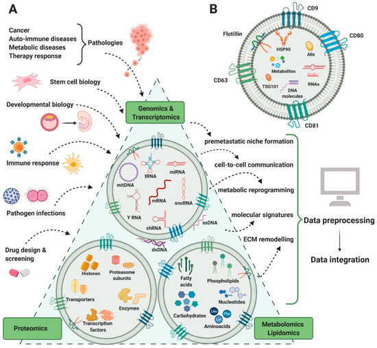 Correlation between EVs content in RNA, protein, lipid, and metabolites types and the multiple omics analyses that EV data integration can generate. Several areas of biology and medical research (input) generate complex genomics, transcriptomics, proteomics, lipidomics, and metabolomics analysis that can contribute to understanding several biological processes and functions (output). By means of bioinformatics tools, these data will be preprocessed and then integrated in order to answer various biological questions regarding intercellular communication (A). General structure of an EV, with specific EV markers—CD9, CD63, CD80, CD81, flotillin 1, Alix, and TSG101 (B). Figure created with BioRender.com.
