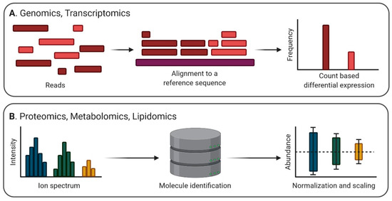 Preprocessing steps for omics data. For sequencing data, reads are curated and then aligned to a reference sequence; further on, gene and transcript quantification occurs through count-based methods (A). For mass spectrometry data, ion peaklists are mapped using database entries; then, identified molecule abundance is normalized for a final biomolecule profile (B). Figure created with BioRender.com.