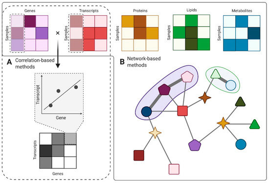 Believed to be some of the most approachable and popular implementations of data integration, correlation-based methods can be used in order to investigate the relationship between two sets of variables [123]. For example, correlations can be estimated between two different sets of omics recorded on the same EV samples, under the assumption of cause–effect relationships. Correlations between genomics and transcriptomics, transcriptomics and proteomics, and transcriptomics and metabolomics might be firstly investigated as they follow the logic of the central dogma of molecular biology [124]. However, the current perspective regarding the cross-talk between omics layers recognizes their bidirectional modulation; therefore, correlations between metabolomics and genomics might be of interest as well [125].