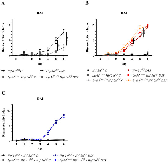 Myeloid HIF-1α knockout ameliorated whereas myeloid HIF-2α knockout aggravated colitis. Daily recording of the disease activity index (DAI) value with separate presentation for the different animal strains with and without dextran sodium sulfate (DSS) treatment. Statistical analysis was performed with a 2-way ANOVA (mean values ± SEM; (A): n(C) = 2, n(DSS) = 3; (B): n(C) = 3 (LysMCre/Cre Hif-2αfl/fl)/8 (Hif-2αfl/fl; LysMCre/+ Hif-2αfl/fl), n(DSS) = 8 (LysMCre/Cre Hif-2αfl/fl)/18 (Hif-2αfl/fl; LysMCre/+ Hif-2αfl/fl); and (C): n(C) = 7, n(DSS) = 14). *: p < 0.05; ***: p < 0.001.