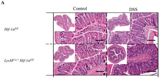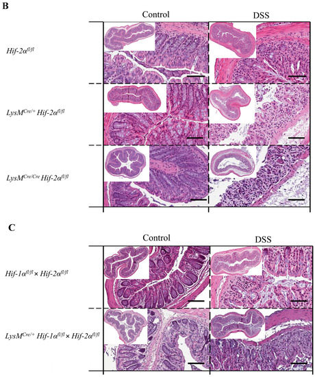 Myeloid knockout of HIF-1α leads to low tissue destruction, while myeloid knockout of HIF-2α increased it. Exemplary presentation of H&E-stained colon tissue sections of (A) Hif-1αfl/fl, LysMCre/+ Hif-1αfl/fl animals, (B) Hif-2αfl/fl, LysMCre/+ Hif-2αfl/fl and LysMCre/Cre Hif-2αfl/fl animals, and (C) Hif-1αfl/fl × Hif-2αfl/fl and LysMCre/+ Hif-1αfl/fl × Hif-2αfl/fl animals after DSS treatment and the control group. Tissue sections from DSS-treated LysMCre/Cre Hif-2αfl/fl animals showed the highest structural damage of tissue. Tissue sections from DSS-treated LysMCre/+ Hif-1αfl/fl animals showed the least structural damage. A: n(Control) = 2, n(DSS) = 3; B: n(Control) = 3 (LysMCre/Cre Hif-2αfl/fl)/8 (Hif-2αfl/fl; LysMCre/+ Hif-2αfl/fl), n(DSS) = 8 (LysMCre/Cre Hif-2αfl/fl)/18 (Hif-2αfl/fl, LysMCre/+ Hif-2αfl/fl); and C: n(Control) = 7, n(DSS) = 14. Magnification overview image: 100×; magnification detail image: 200×; and scale bar: 100 µm.