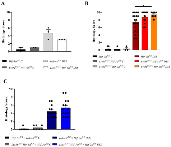 DSS-treated Hif-1αfl/fl-, Hif-2αfl/fl-, and Hif-1αfl/fl × Hif-2αfl/fl-, but also LysMCre/+ Hif-1αfl/fl × Hif-2αfl/fl animals showed a lower damage of the tissue structure with many intact crypts and a lower infiltration of immune cells (Figure 2A,C). The least damage was found in LysMCre/+ Hif-1αfl/fl animals, which exhibited the most intact crypts and a low infiltration of immune cells. These data suggest that a HIF-1α knockout in cells of the myeloid lineage led to less tissue damage in DSS-induced colitis and less disease progression whereas a double knockout of HIF-1α and HIF-2α had no effect on tissue damage during DSS-induced colitis after 6 days.