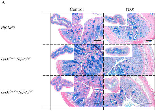 The protective barrier of the gastrointestinal tract is supported by mucin production. All mucopolysaccharides and acetic acid mucins were therefore analyzed by means of an alcian blue staining. The animals of the control groups showed small, circular structures stained by alcian blue (Figure 4). In the basal half of the tunica mucosa these structures were close together and corresponded with the position of the Goblet cells. In the luminal half of the tunica mucosa large, round structures were occasionally observed. No clear differences between the different genotypes were detected (Figure 4C,D). The colon tissue sections of the DSS-treated animals showed mainly large, round structures. In damaged areas of the colon tissue, no staining with alcian blue was visible and the quantitative analysis revealed significantly less alcian blue expression in DSS treated LysMCre/Cre Hif-2αfl/fl animals (Figure 4C). Additionally, the colon tissue sections of Hif-2αfl/fl, LysMCre/+ Hif-2αfl/fl and LysMCre/Cre Hif-2αfl/fl animals showed many positive cell nuclei stained with alcian blue. These were hardly detectable in the tissue sections of Hif-1αfl/fl × Hif-2αfl/fl and LysMCre/+ Hif-1αfl/fl × Hif-2αfl/fl animals (Figure 4B), which also exhibited more large, round alcian blue stained structures in the tunica mucosa and changes in overall alcian blue quantification. Thus, in animals with a HIF-2α knockout the lowest alcian blue staining was found due to the highest tissue damage after DSS treatment (Figure 4A,C). This indicates that extensive tissue damage reduced the production of mucins in the colon.