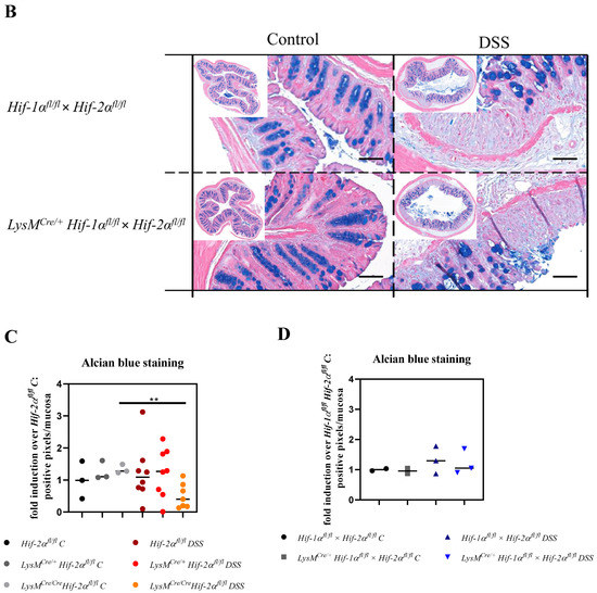 Reduced mucin production after tissue destruction. Exemplary presentation of alcian blue-stained colon tissue sections of (A) Hif-2αfl/fl, LysMCre/+ Hif-2αfl/fl and LysMCre/Cre Hif-2αfl/fl animals and (B) Hif-1αfl/fl × Hif-2αfl/fl and LysMCre/+ Hif-1αfl/fl × Hif-2αfl/fl animals with and without DSS treatment and quantification of histological data (C,D). No positive alcian blue staining was observed in damaged colon areas. Statistical analysis was performed with an unpaired t-test; (A): n(Control) = 3 (LysMCre/Cre Hif-2αfl/fl)/5 (Hif-2αfl/fl, LysMCre/+ Hif-2αfl/fl), n(DSS) = 8 (LysMCre/Cre Hif-2αfl/fl)/12 (Hif-2αfl/fl, LysMCre/+ Hif-2αfl/fl), (B): n(Control) = 2, n(DSS) = 3. counterstaining: eosin. Magnification overview image: 100×; magnification detail image: 200×; and scale bar: 100 µm, (C,D): every indicated spot depicts the quantitative analysis of a complete cross section of one colon. **: p < 0.01.