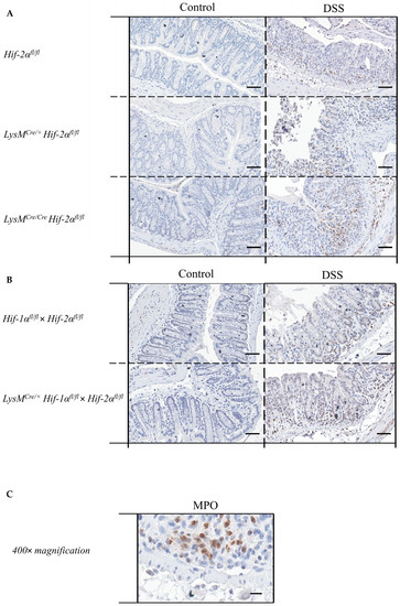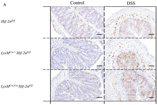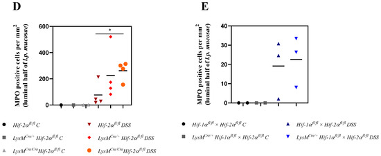 The control groups showed no MPO-positive cells in the colon tissue sections. In the tissue sections of the DSS-treated animals, there was a clear increase in the number of MPO-positive cells (Figure 6A,B). DSS-treated Hif-2αfl/fl, Hif-1αfl/fl × Hif-2αfl/fl and LysMCre/+ Hif-1αfl/fl × Hif-2αfl/fl animals showed MPO-positive cells especially in the tela submucosa and in the basal part of the lamina propria mucosae. DSS- treated LysMCre/+ Hif-2αfl/fl und especially DSS-treated LysMCre/Cre Hif-2αfl/fl animals showed MPO-positive cells also in the tela submucosa but also increased at the top of the lamina propria mucosae (Figure 6D). This result indicates that HIF-2α might play a role for the invasion of neutrophils.