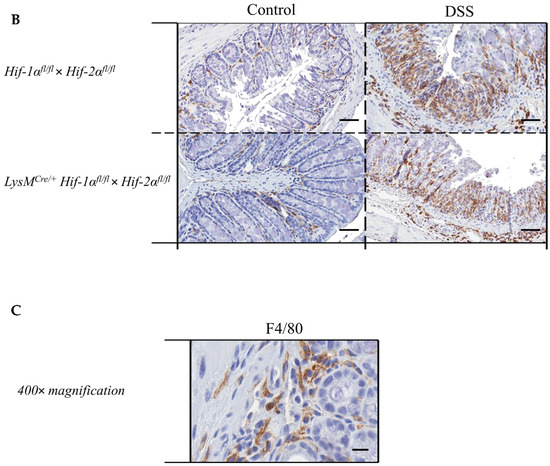 Due to the fact that macrophages played a crucial role in the DSS model of LysMCre/+ Hif-1αfl/fl- animals [15] and that macrophages are the cells carrying the knockout analyzed herein, the F4/80 protein was detected in colon tissue sections with the help of a specific antibody.