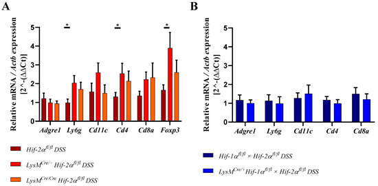 Myeloid knockout of HIF-2α increased the numbers of neutrophils and T-cells in inflamed colon tissue. The expression of Adgre1, Ly6g, Cd11c, Cd4, Cd8a, and Foxp3 were quantitatively determined by qPCR in the colonic tissue of DSS-treated animals. After 6 days of DSS treatment an increased expression of Ly6g, Cd4, Cd8a, and Foxp3 were observed in RNA samples from DSS-treated LysMCre/+ Hif-2αfl/fl and LysMCre/Cre Hif-2αfl/f animals. Statistical analysis was performed with an unpaired t-test (mean values ± SEM; (A): n = 6 (LysMCre/Cre Hif-2αfl/f)/15 (Hif-2αfl/fl, LysMCre/+ Hif-2αfl/fl); (B): n = 14). All data were normalized to the untreated wildtype control. Gene expression of untreated animals did not differ markedly from the respective wildtype control and is depicted in suppl. Figure S4. *: p < 0.05.
