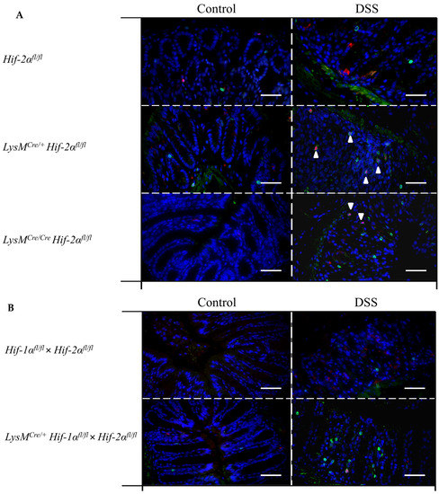 Myeloid knockout of HIF-2α increased the numbers of T-cells and Treg cells in inflamed colon tissue. Exemplary presentation of CD3- (green, surface staining) and FoxP3- (red, nuclear staining) stained colon tissue sections of (A) Hif-2αfl/fl, LysMCre/+ Hif-2αfl/fl and LysMCre/Cre Hif-2αfl/fl animals, and (B) Hif-1αfl/fl × Hif-2αfl/fl and LysMCre/+ Hif-1αfl/fl × Hif-2αfl/fl animals with and without DSS treatment. (A,B): n(Control) = 2; n(DSS) = 4 (magnification 200×, scale bar: 100 µm). Marked cells (arrows) are double-positive for CD3 and FoxP3.