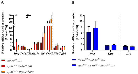 IFNγ, TNFα, IL23, IL17a, IL6, and CXCL1 belong to the proinflammatory cytokines and are expressed by immune cells [34,35,36]. In samples from DSS-treated LysMCre/+ Hif-2αfl/fl animals increased Ifng expression was observed compared to samples from DSS-treated Hif-2αfl/fl and LysMCre/Cre Hif-2αfl/fl animals and samples from the control group (Figure 10). Tnfa and Il17a expression were increased in all DSS-treated animals without significant differences between the groups. Additionally, Cxcl1 was increased in samples from DSS-treated Hif-2αfl/fl, LysMCre/+ Hif-2αfl/fl, and LysMCre/Cre Hif-2αfl/fl animals compared to the control group (Figure 10). No difference in expression was observed between samples from DSS-treated Hif-2αfl/fl and LysMCre/+ Hif-2αfl/fl animals, whereas samples from DSS-treated LysMCre/Cre Hif-2αfl/fl animals showed an additional increase in their Cxcl1 expression. Il6 expression was stepwise increased in samples from DSS-treated Hif-2αfl/fl, LysMCre/+ Hif-2αfl/fl, and LysMCre/Cre Hif-2αfl/fl animals (Figure 10). In contrast, in samples from DSS-treated Hif-2αfl/fl and LysMCre/+ Hif-2αfl/fl animals we observed a significantly decreased Il23a expression compared to samples from the control group and to samples from DSS-treated LysMCre/Cre Hif-2αfl/fl animals. In samples of DSS-treated LysMCre/Cre Hif-2αfl/fl animals, we observed a lower expression of Il23a but in contrast to the expression in the latter groups it was no longer significantly different from the control group. RNA samples from DSS-treated Hif-1αfl/fl × Hif-2αfl/fl and LysMCre/+ Hif-1αfl/fl × Hif-2αfl/fl animals also showed an increased Ifng expression with a higher SEM and a slightly increased Tnfa expression.
